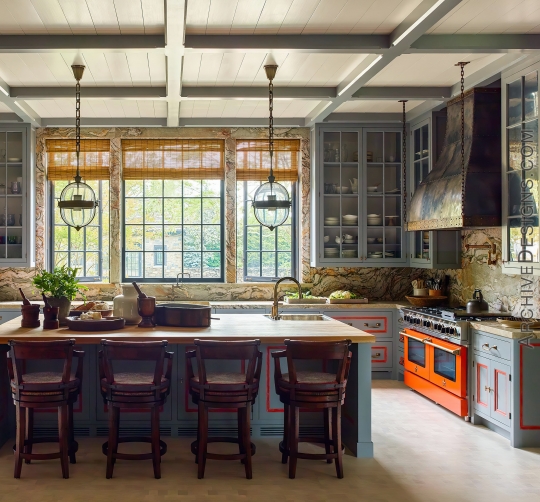 A dark patina kitchen hood in distressed stainless and hammered brass, with specialty chain supports. Archive Designs created this hood for a S.R. Gambrel project in Watermill, New York.