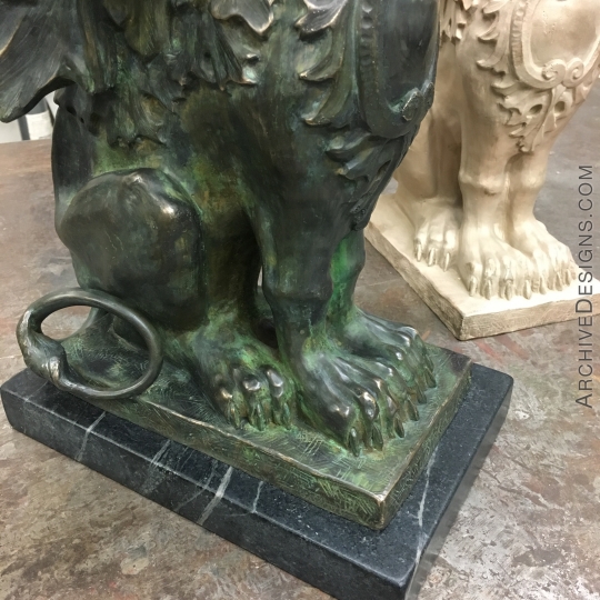 Leogriffins in bronze sculpted by Joe Mross with a verde patina (2nd Edition). This design is based on a wood carving featured on furniture by the RJ Horner & Co. from 1886.